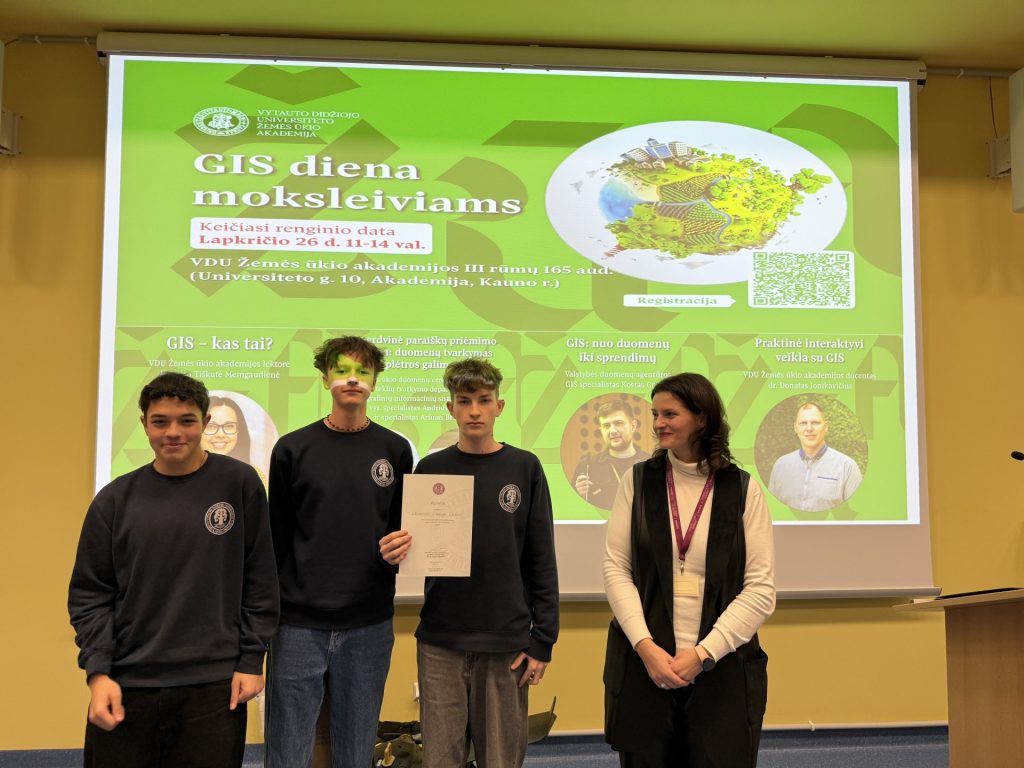 Lapkričio 26 d. Vytauto Didžiojo universiteto Žemės ūkio akademijoje vykusiame renginyje „GIS diena 2025“ dalyvavo Iv1, I ir II akademinės klasės bei III Ežerėlio skyriaus mokiniai, lydimi geografijos mokytojų Aistės Vilimės ir Eglės Poderienės.