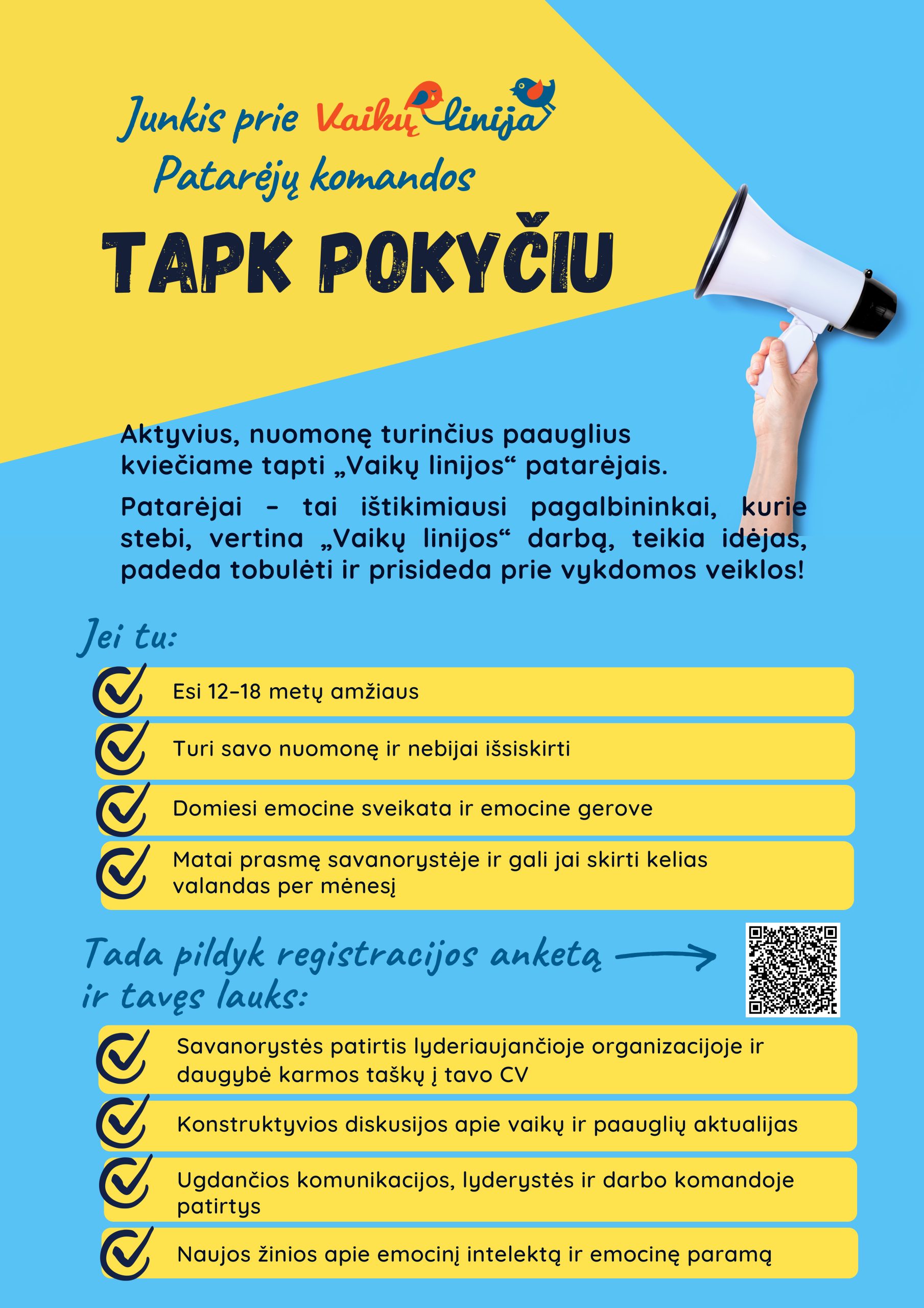 „Vaikų linijai“ reikia Tavo patarimų!  Tapk pokyčiu – junkis prie naujai kuriamos Patarėjų komandos!