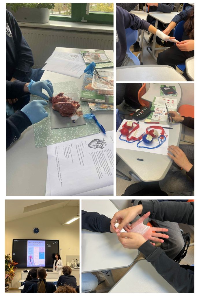 Iv1 klasės mokiniams pamokų ciklą iš temos „Kraujas ir kraujotaka“ vedė Vytauto Didžiojo universiteto STEAM – biologijos ir chemijos IV kurso studentė Zinaida Jurevičiūtė. Mokiniai išgirdo temos teorinę dalį, atliko praktinius darbus, mokėsi suteikti pirmą pagalbą, stebėjo praktinę demonstraciją, o vėliau patys išbandė tvarstymo technikas. Čia jai talkino LSMU studentė – būsima slaugytoja, Saulė.